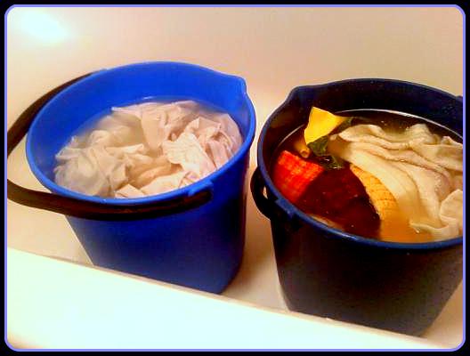 I have been struck with a frugal housewife attitude. Is that normal? For me getting excited about housekeeping isn't really normal. But I am planning on making my own laundry soap and I'm excited about it. Above are two buckets of dirty, soapy laundry sitting in my bathtub. For things like underwear or dishrags that don't take up a whole load I hand wash. Partly because I think it's wasteful not to, and partly because we don't have our own washing and drying machines. There are a couple downstairs, provided by our landlord. But it costs $1.50 to wash and dry them, and as long as I'm not too busy it's not hard to stir them around in a bucket with a plastic spoon to save some change and electricity.